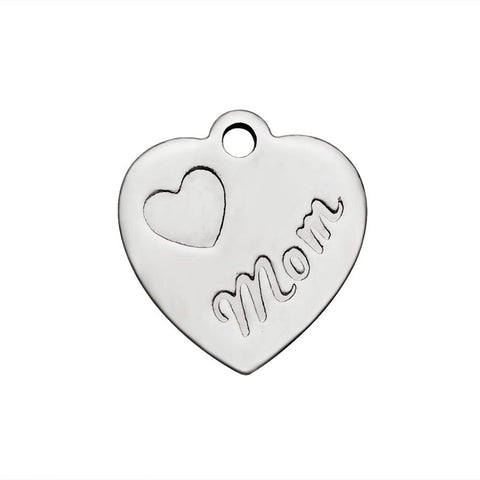 304 Stainless Steel Charms, Heart with Mom, Stainless Steel Color