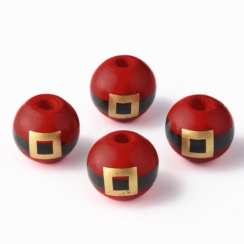 Painted Natural Wood Beads, Round with Belt, Christmas Style, Red